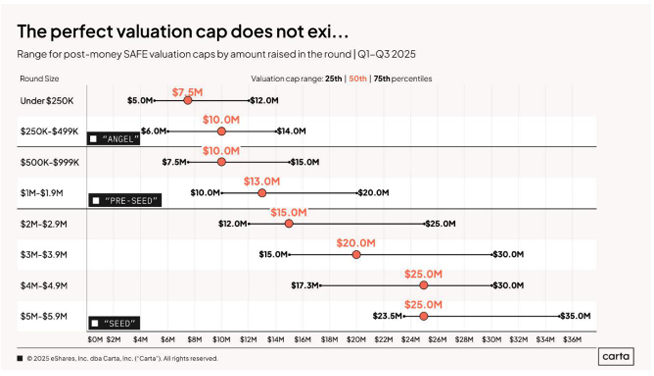 As the data from Carta shows, in the current environment valuations caps of $10M at pre-seed are the norm, with the top quartile of deals being done at $15M - $20M.