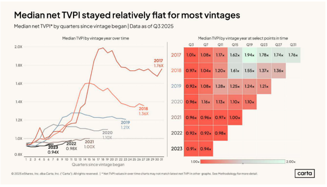 Again from Carta, below we have data for median TVPI figures for venture capital funds of the 2017 – 2023 vintages. For example, a 2017 vintage fund has a median TVPI of 1.76x.