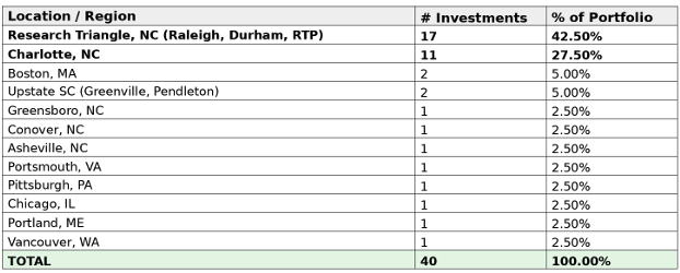 The table below depicts where our portfolio companies are located. You will see that the two dominant clusters are the Charlotte and Triangle areas of North Carolina.