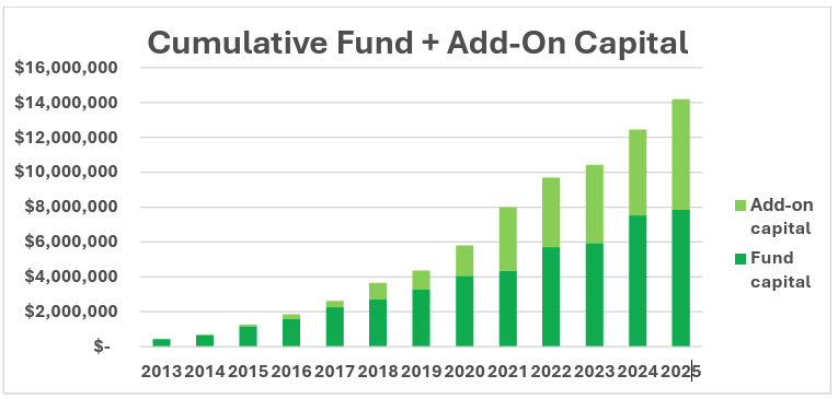 Below you can see how CAF’s cumulative fund capital plus add-on investments will soon cross the $15 million threshold.
