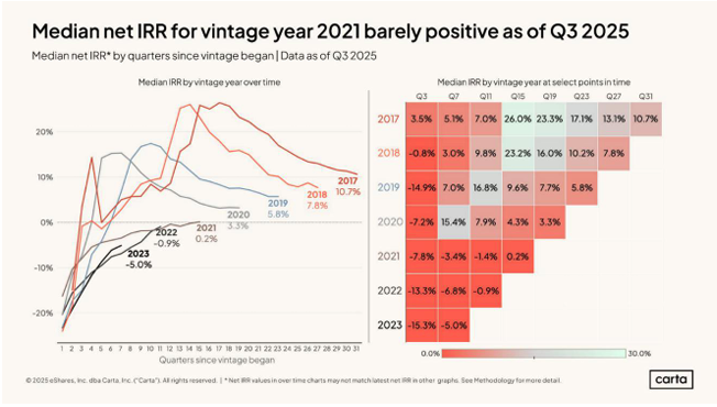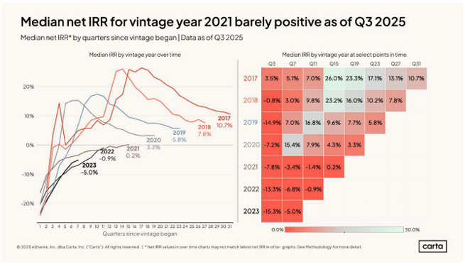 Here is data from Carta, showing median IRR information for venture capital funds of the 2017 - 2023 vintages. For example, a 2017 vintage fund has a median IRR of 10.7%