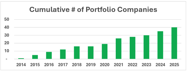 Annual companies added to our portfolio ranged from zero in 2019 to seven in 2021. Overall, we have invested in 40 companies to date.