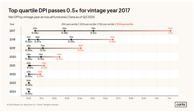 To provide some context, below is data from Carta showing the DPI data for venture capital funds of the 2017 – 2024 vintages. A fund’s vintage is the year in which it was established. For example, for 2017 vintage funds the median DPI is 0.28, with top quartile DPI being anything 0.51 or higher.